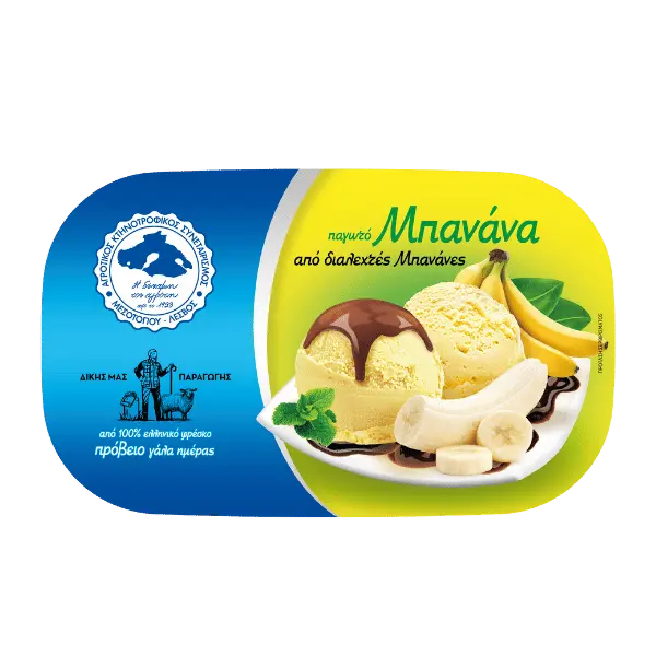 SHEEP’S MILK ICE CREAM - BANANA Made exclusively from fresh sheep’s milk and ripe bananas, the banana ice cream of the Mesotopos Cooperative stands out for its natural sweetness and velvety texture. The smooth flavor of banana blends harmoniously with the creamy richness of sheep’s milk, offering a balanced, aromatic ice cream with authentic character.