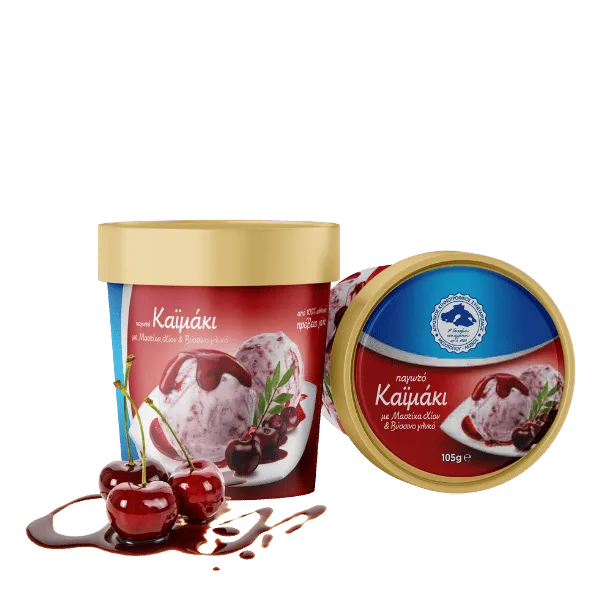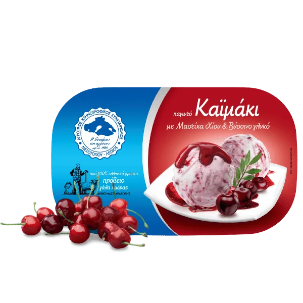 SHEEP’S MILK ICE CREAM KAIMAKI WITH CHIOS MASTIC & SOUR CHERRIES Made exclusively from fresh sheep’s milk, the kaimaki ice cream with Chios mastic and sour cherries of the Mesotopos Cooperative combines a traditional creamy texture with the aromas of authentic Greek ingredients. The delicate, refreshing intensity of mastic blends harmoniously with the sweet-tart freshness of sour cherries, creating a balanced, aromatic ice cream full of character.