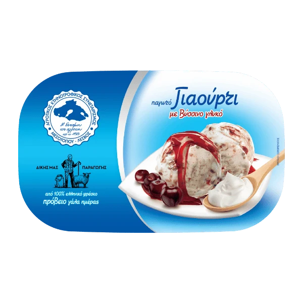 SHEEP’S MILK ICE CREAM – YOGURT WITH SOUR CHERRY Made exclusively from fresh sheep’s milk and sheep’s yogurt, the yogurt ice cream with sour cherry preserve of the Mesotopos Cooperative offers a refreshing and well-balanced tasting experience. The mild tanginess of yogurt blends harmoniously with the sweet-tart intensity of sour cherry preserve, creating an ice cream with a fresh aroma, a light mouthfeel, and a clean character.
