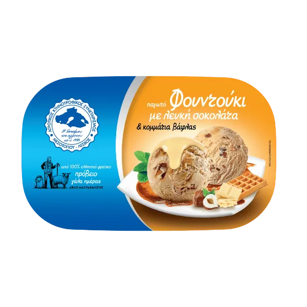ΠΑΓΩΤΟ ΠΡΟΒΕΙΟΥ ΓΑΛΑΚΤΟΣ – ΦΟΥΝΤΟΥΚΙ ΜΕ ΛΕΥΚΗ ΣΟΚΟΛΑΤΑ Φτιαγμένο αποκλειστικά από φρέσκο πρόβειο γάλα, εκλεκτό φουντούκι και λευκή σοκολάτα, το παγωτό φουντούκι με λευκή σοκολάτα του Συνεταιρισμού Μεσοτόπου συνδυάζει την πλούσια γεύση ξηρών καρπών με τη βελούδινη γλυκύτητα της σοκολάτας. Η κρεμώδης υφή του πρόβειου γάλακτος αγκαλιάζει τις νότες φουντουκιού και λευκής σοκολάτας, δημιουργώντας ένα παγωτό ισορροπημένο, απολαυστικό και γεμάτο χαρακτήρα.